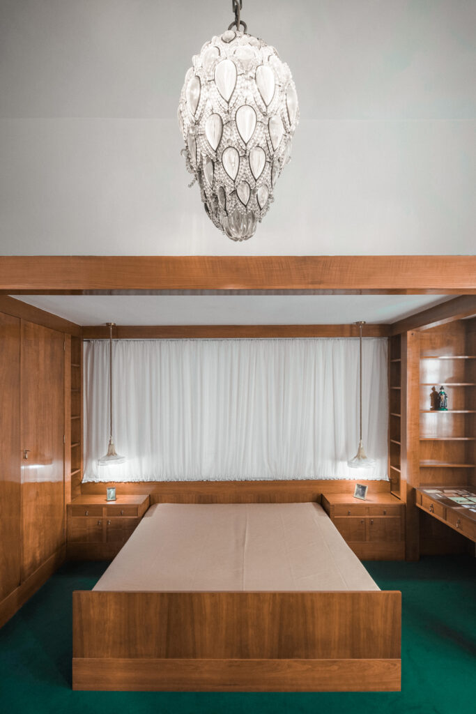 The master bedroom is designed in a warm cherry wood tone with a white ceiling with a decorative large glass drop-shaped chandelier hanging in the middle. Hedvika Liebstein’s bedroom, which is ingeniously equipped with built-in wardrobes and a sofa bed, is a decadent colour harmony of light ash wood and textiles reminiscent of the luxurious train compartments of its time.