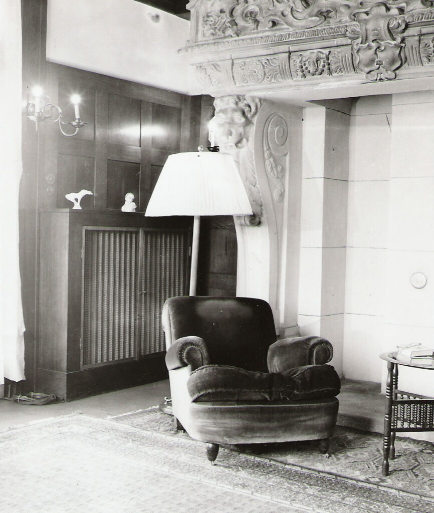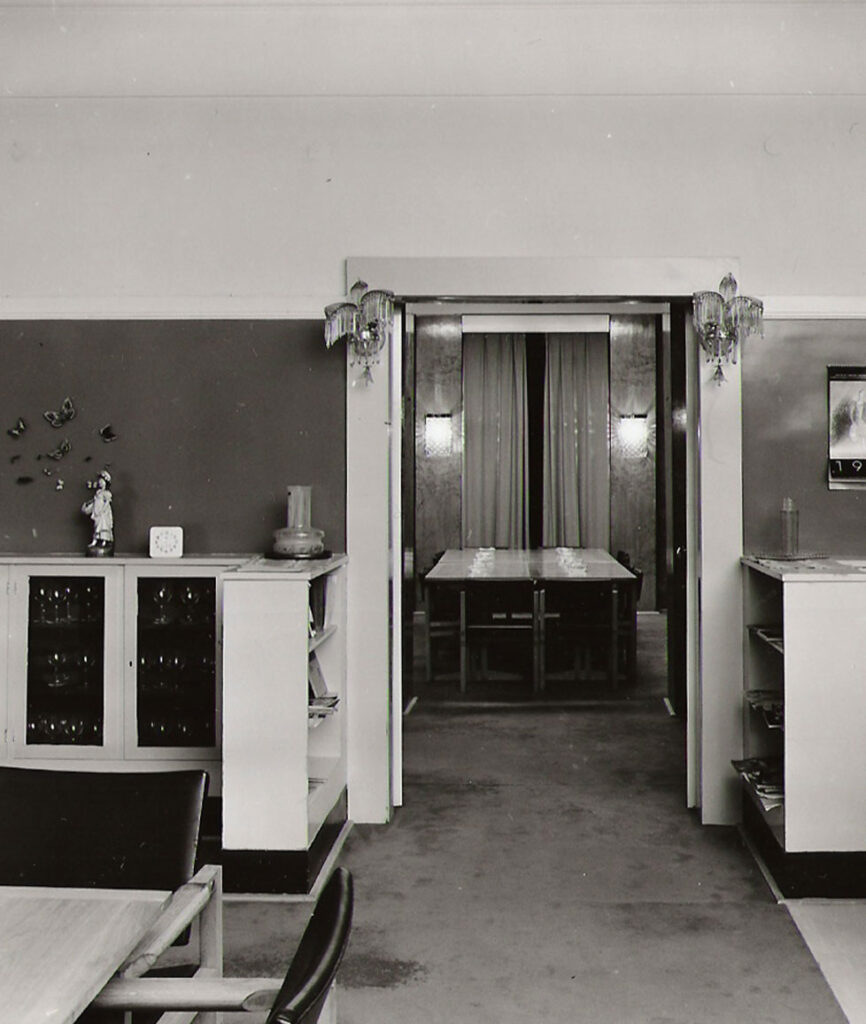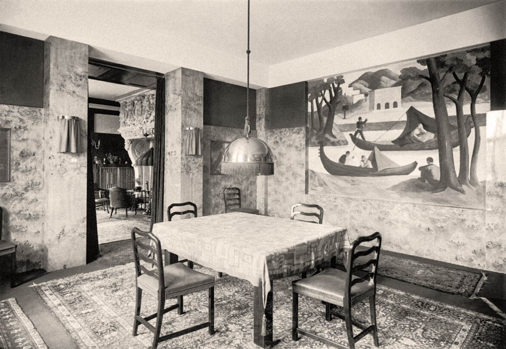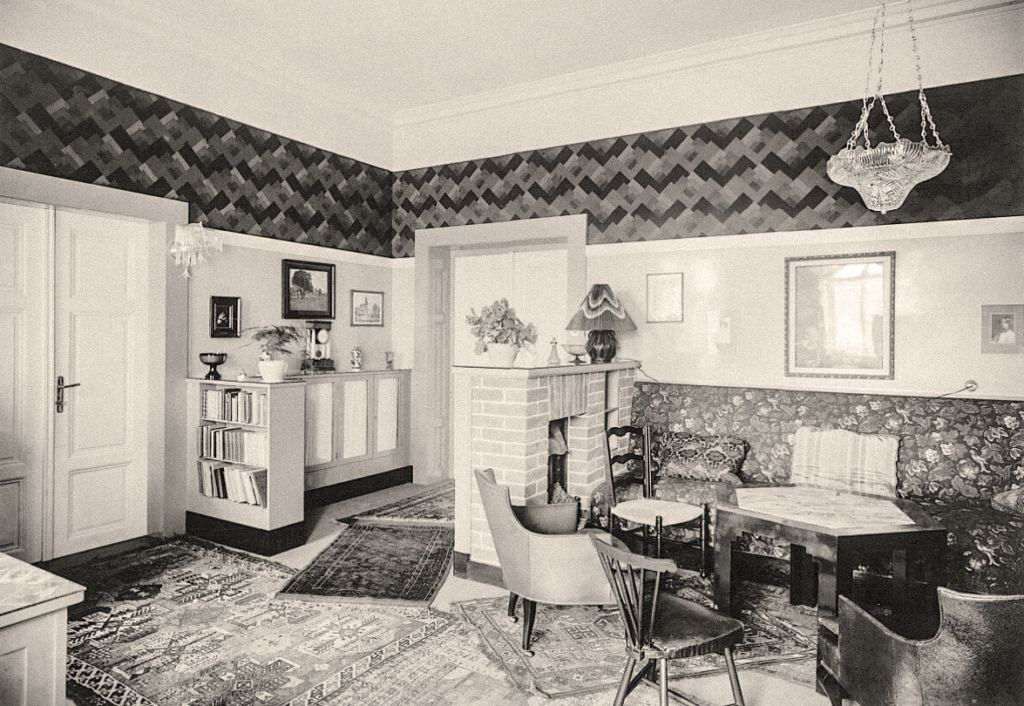 The aforementioned Robert Aigner, the author of the fresco in the dining room, worked in Vienna, where he also created many decorative public commissions, especially after the Second World War. World War II. Jan Brummel’s cousin, the versatile visual artist Edita Hirsch, often stayed in the house. She worked in Prague as a portrait painter, but also as a fashion designer and cartoonist, publishing in the Prague and international press. For example, she regularly contributed illustrations from the 1937 World Exhibition in Paris to Prague’s “Pestrý týden”, and created the popular character of Winkle the dog for an English newspaper.
